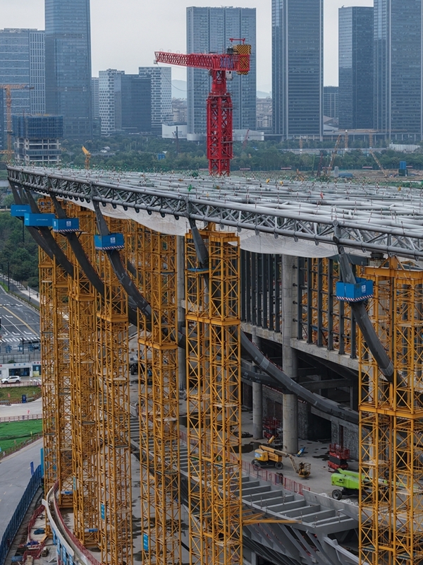 目前,体育馆及游泳跳水馆工程主体结构全面封顶,已进入大规模钢结构施工阶段;足球场工程钢屋盖整体进度过半,主体结构已完成90%,项目建设正稳步推进。