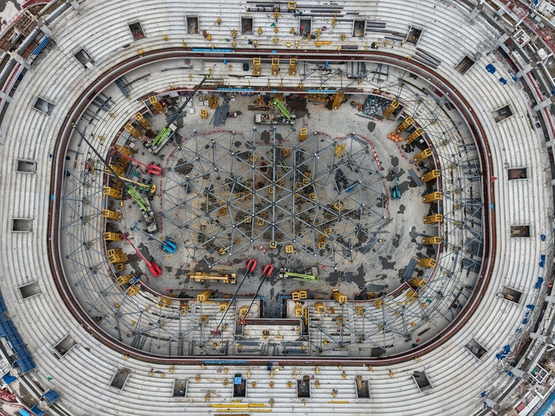 10月21日拍摄的余杭国际体育中心工程足球场项目(无人机照片)。据了解,足球场钢结构设计总重量达42000吨,其中屋盖钢结构占18000吨。